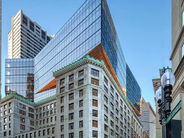 コングレス広場の再開発には、街区全体にまたがる 5 つの相互接続された歴史的な商業ビルの大規模な改修と増築が伴い、その中には印象的な 7 階建てのモダンなガラス張りの増築も含まれています。