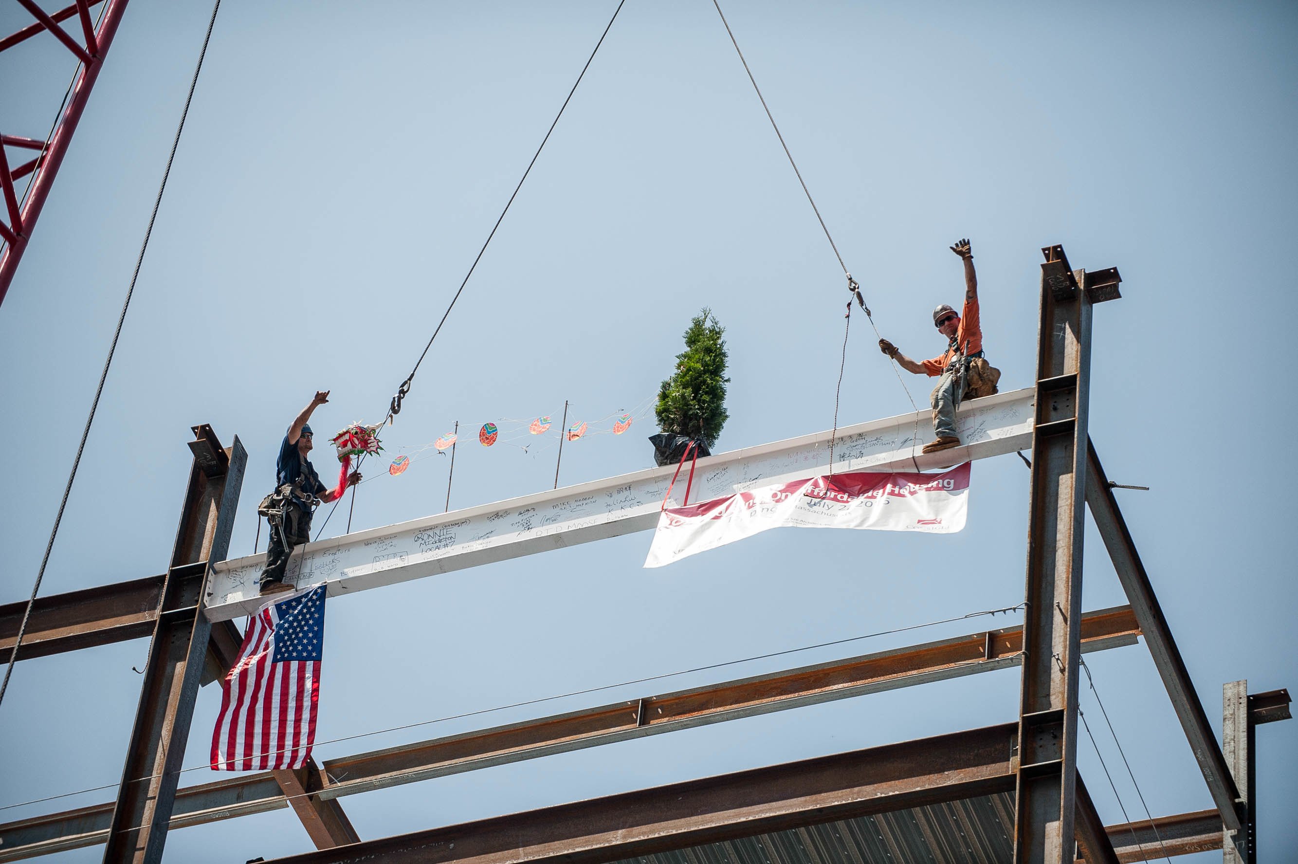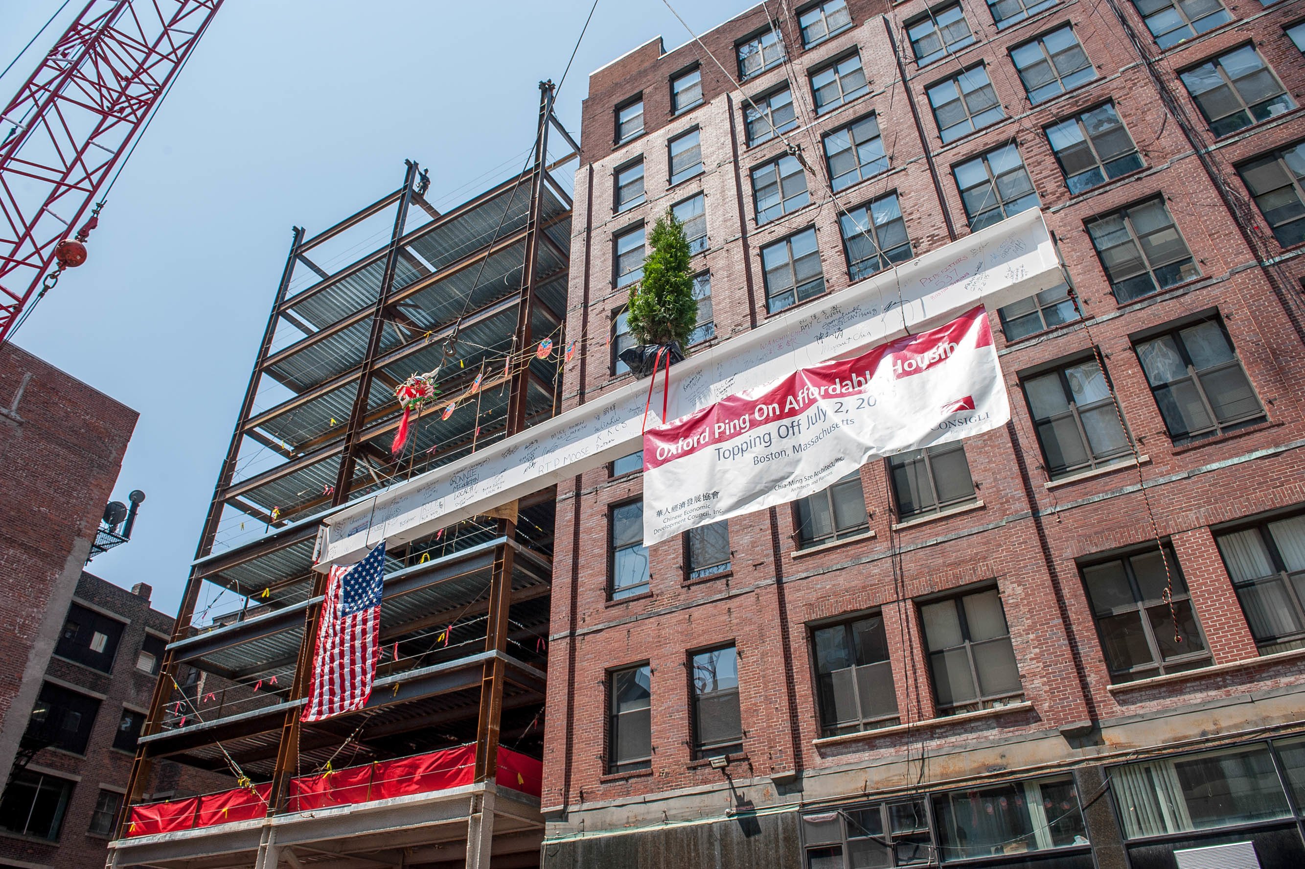 60,000 平方フィートの 11 階建ての建物に設置される最後の鉄骨梁の署名は、チャイナタウンの低所得層に 67 戸の賃貸アパートを提供する住宅開発の建設における重要なマイルストーンを示します。