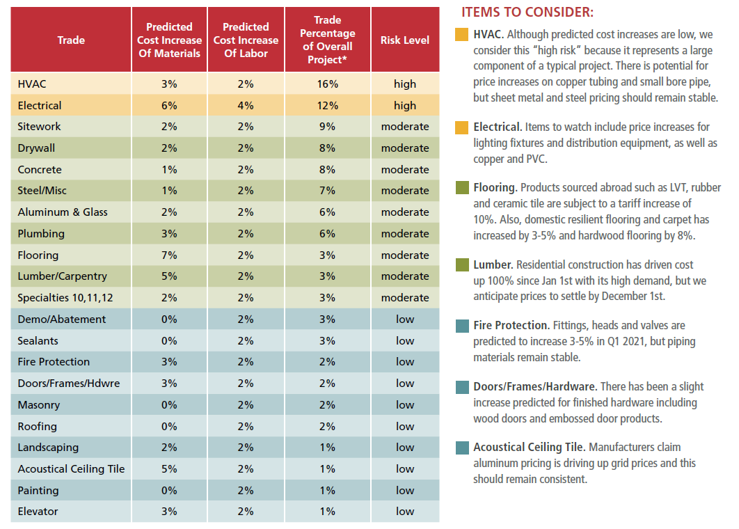 昨年の過熱した市場と比較して、ほぼすべての取引で通常よりも優れた入札範囲と積極的な価格設定を経験しています。下請け業者は受注残が健全であると報告していますが、将来が不確実であるため、2021 年と 2022 年の仕事を積極的に予約しようとしています。また、調査対象となった下請け業者の 93% は、必要に応じて追加の人員を確保できると自信を持っています。彼らは仕事に戻り、現在の人員需要を維持しています。バカラ ルール 簡単感染症ワクチンが開発されると、建設市場がバカラ ルール 簡単感染症以前の活動レベルに戻り始める傾向があり、建設コストが上昇する可能性があります。したがって、今が今後のプロジェクトを進める時期です。