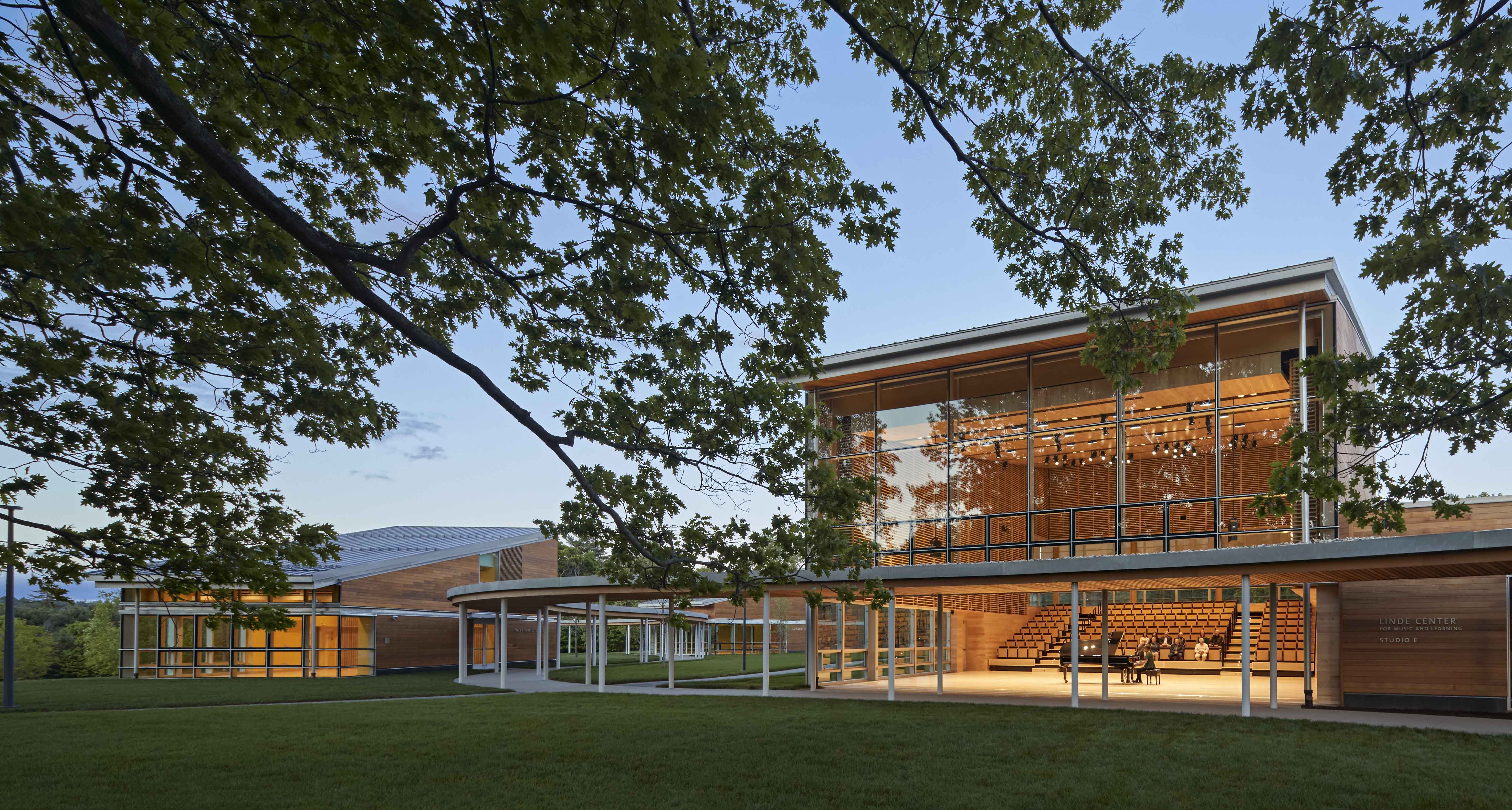 イタリア カジノグルウッドのリンデ センターは、リハーサル、講義、イベント用の 200 席の多目的スタジオ、サーバーと業務用キッチンを備えた 150 席のカフェの建物、追加の 2 つの学習/練習スタジオを結ぶ曲線状の屋根付き通路を含む、相互接続された複合施設です。この施設には、名門サマーアカデミーであるイタリア カジノグルウッド ミュージック センターと、人気の講義および成人教育プログラムであるイタリア カジノグルウッド ラーニング インスティテュート専用のスペースがあります。このプロジェクトには、最新のキャンパス園芸計画も組み込まれており、新しい灌漑システム、樹齢 100 年のオークの木の保存、コンサート来場者に歓迎の日陰を提供する 140 本以上の新しい木や低木の植栽が必要でした。