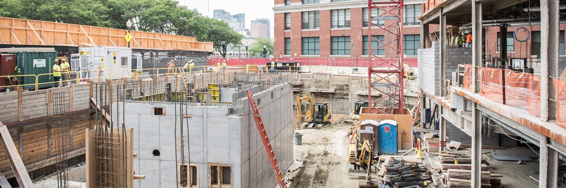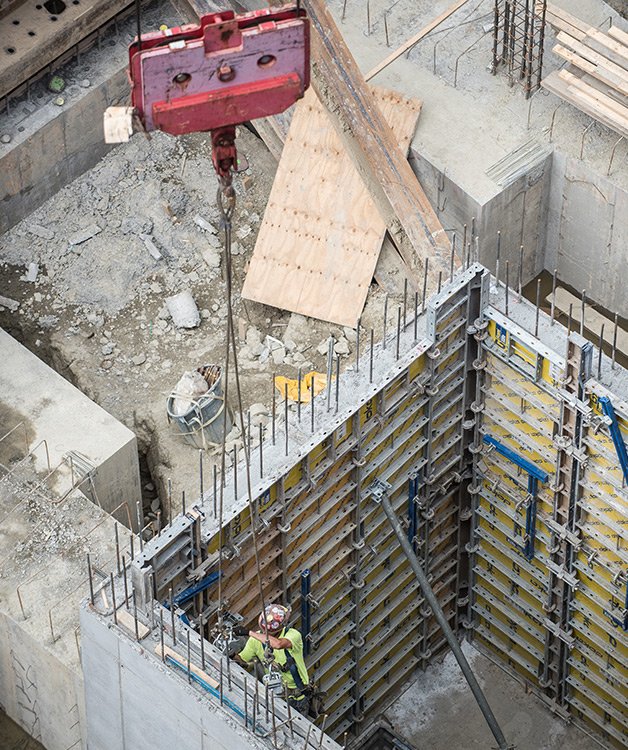 - 現在進行中の別の高層建設現場に直接隣接するプロジェクトを安全に管理するための高度に調整された物流