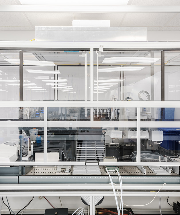 アッヴィのイタリア カジノラボは、活発な研究環境内に位置する1,350平方フィートの研究スペースであるラボ3129を改修した結果です。既存スペースは天井、壁、床をすべて取り壊しました。新しい移動式ラボのケースワークが設置され、床材、壁、天井、M/E/P システムも更新されました。隣接する既存の暗室 3126 と既存のオフィス 3127 は、新しいイタリア カジノラボ ユーザーをサポートするために、新しいブルペンとハドル ルームに改装されました。
