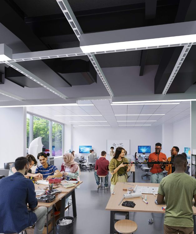 50,000 平方フィートの新しい建設プロジェクトには、学生俳優、アーティスト、ミュージシャン、技術者にスポットライトを当てるための 550 席の講堂と 100 席のブラック ボックス シアターが含まれています。教育スペース、リハーサルおよび練習室、シーンショップ、更衣室、レコーディングスタジオとコントロールルームを備えた音楽アカデミーにより、学生はさまざまな形で創造性を開発し、ハックリー大学の視覚芸術と舞台芸術を高めることができます。スタジオと柔軟なコンピューター サイエンスの教室は、分野を超えたコンピューター サイエンスの指導のための最先端の学習環境を構築します。