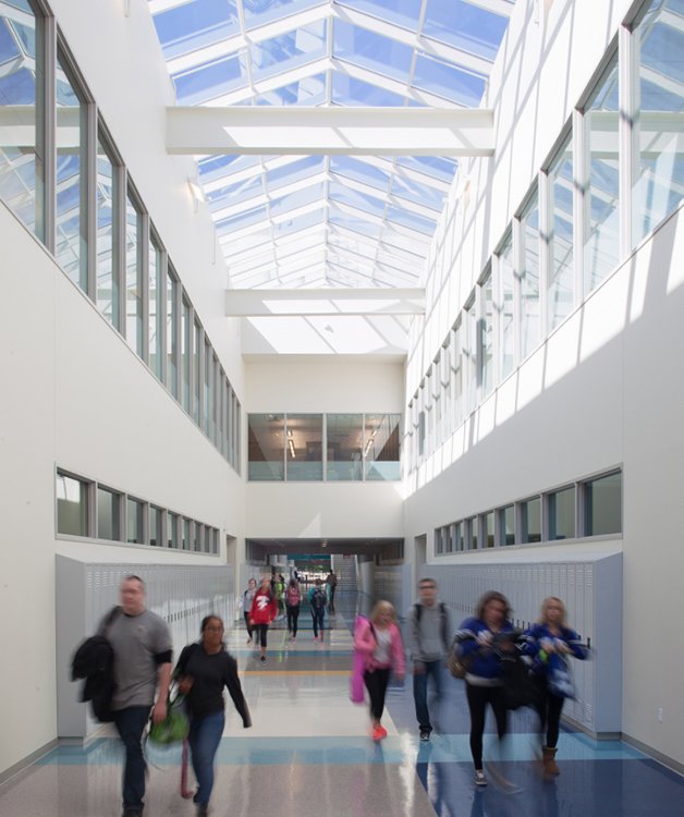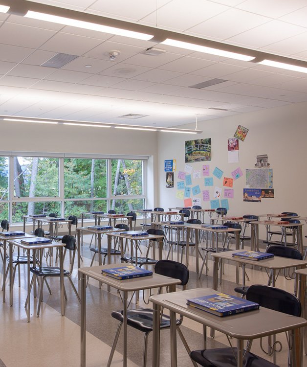 このプロジェクトには、満室となった342,000平方フィートのバカラ やり方の段階的建設アプローチが含まれていました。建物内に建設用の空きスペースを作るため、9 年生は近くの学校の仮住まいに住まわせてもらいました。プロジェクトの範囲には、合計78,300平方フィートの既存建物の一部の選択的取り壊し、105,000平方フィートの追加、および残りの263,700平方フィートの既存の2階建て学校の再建が含まれていました。再活性化されたスペースには、新しい教室、研究室、オフィス、管理スペースのほか、施設の既存のアイスリンクとフィールドハウスの限定的な改修が含まれます。既存の建物の一部が取り壊された場所にある増築棟には、新しいカフェテリア、メディアセンター、講堂、美術教育スペースが設置されています。このプロジェクトは、マサチューセッツ高パフォーマンス学校協同組合 (MA-CHPS) の基準を達成しました。