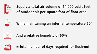 Each building will have unique requirements and timing for an optimal flush-out, but in general, the following LEED flush-out calculation can be used as a guideline:
