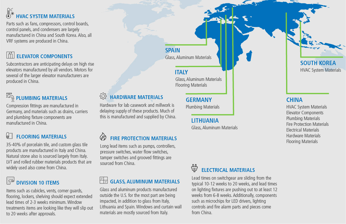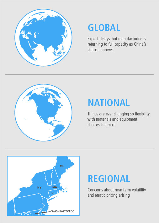 Supply of materials in the Northeast mirror what we’re seeing nationally with the exception of imports from Canada; however, of materials sourced from Canada (such as structural steel and HVAC equipment) are also starting to become concerning. Newly implemented travel restrictions have not blocked the import of materials, but Canada is ramping up its precautionary measures daily which will eventually affect manufacturing output.